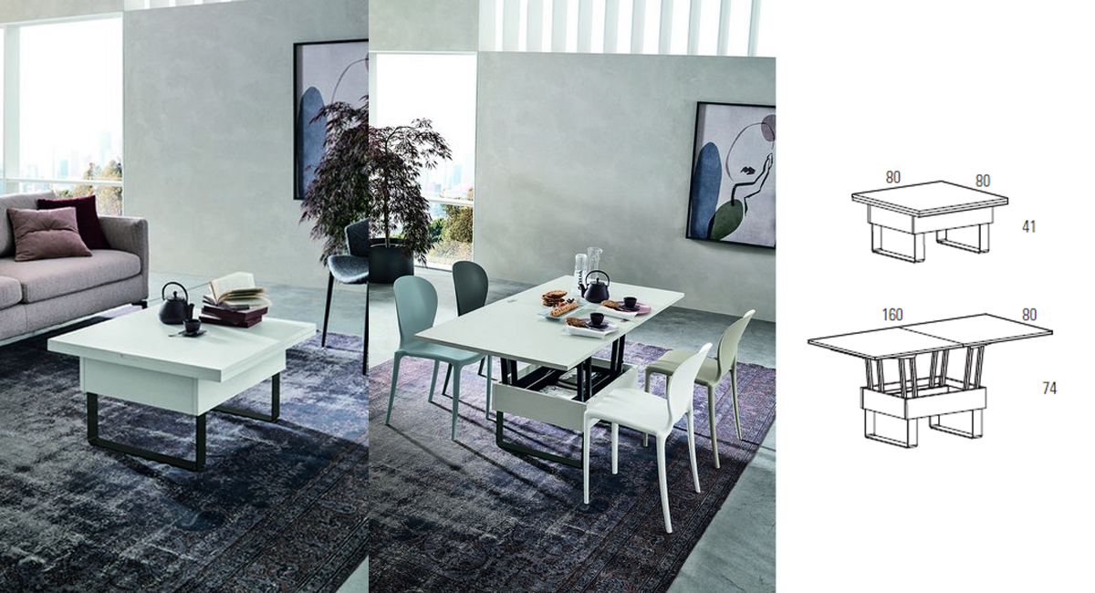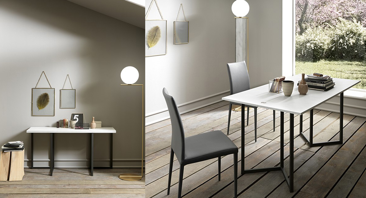 Il tavolino trasformabile Vision, proposto in catalogo da Sedit, ha una struttura in metallo antracite e un piano materico color bianco gesso, facilmente contestualizzabile in diversi stili d'arredo. Con un semplice gesto verso l'alto e, grazie alla sua apertura a libro, riesce a offrire fino a 160 cm di lunghezza per ospitare comodamente sei sedute. Una soluzione 2 in 1 davvero interessante che consente, oltre al risparmio economico su un doppio acquisto, anche un risparmio in termini d'ingombro.